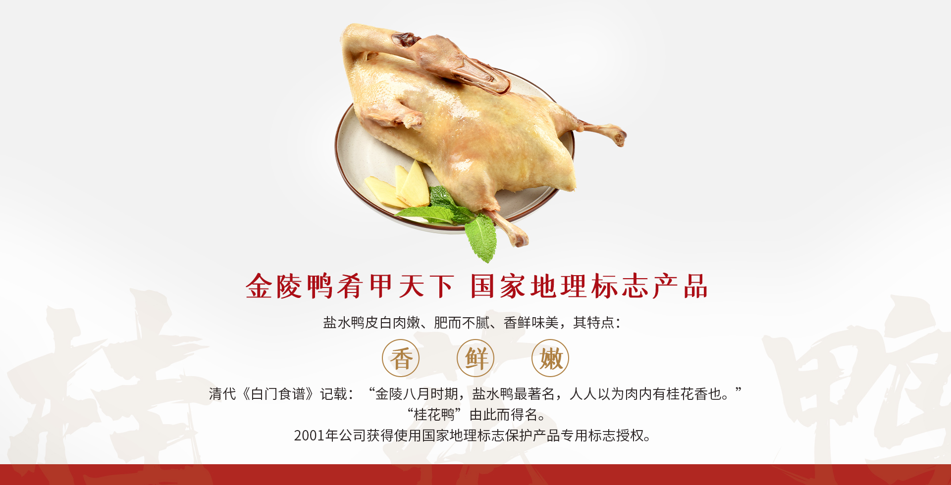 清朝文人張通之在《白門食譜》中寫下“金陵八月時節,鹽水鴨最著名,人人以為肉內有桂花香也”,由這段美食典籍蘊意而生,便有了今日的“桂花鴨”。